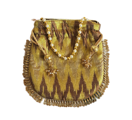 Bring a serene and sophisticated charm to your ensemble with this elegant Azure Toned Floral Luxe Potli. Handcrafted from rich fabric in a calming luminous hue, this potli is gracefully patterned with subtle, classic golden brocade motifs throughout. The design is beautifully finished with an elegant pearl and gold beaded strap and golden drawstrings, completed by delicate golden bead and bell tassels. Perfectly sized for your essentials, this potli is an ideal accessory for day functions and traditional wear.