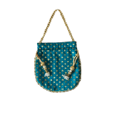 Exude timeless charm with this Gilded Motif Beaded Potli. Handcrafted from premium fabric in a vibrant jewel-toned shade, this accessory is delicately sprinkled with shimmering golden polka dots and intricate circular motifs that catch the light with every movement. The design is elevated by a sophisticated pearl and golden beaded handle and matching drawstrings finished with elegant, clustered tassels. Its classic silhouette and refined detailing make it a versatile companion for weddings, festive dinners, and traditional celebrations.