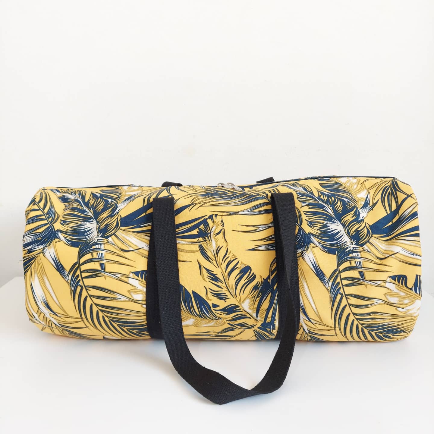 Bring the sunshine with you wherever you go with the Golden Palm Yatra Duffel. This vibrant travel bag is made from a cheerful yellow cotton canvas, covered in a stylish print of deep blue tropical palm fronds. Its generous 18x12x8 inch size makes it an ideal choice for a beach weekend, a sunny holiday, or simply brightening up your gym routine. With two handy side pockets and a secure top zipper, this duffel combines a fresh, modern aesthetic with all the practical features you need for a stylish journey.