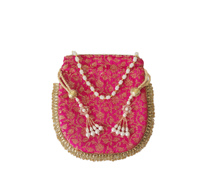 Exude grace with this exquisite piece, adorned in intricate golden floral vine patterns that wrap elegantly around the body of the bag. The silhouette is framed by a glimmering golden border and elevated by a sophisticated multi-strand pearl handle. Designed for those who seek a balance of classic heritage and graceful charm, the dual drawstrings are finished with elaborate white pearl-cluster tassels, making it the perfect companion for grand weddings and traditional celebrations.