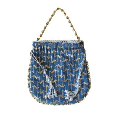 Elegant blue potli with golden chevron detailing and pearl handle—perfect for festive and wedding occasions.
