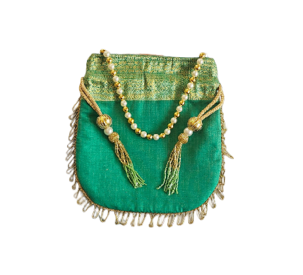 Add a dazzling touch of tradition to your look with this exquisite Ruby Toned Brocade Tassel Potli. Handcrafted from luxurious fabric in a deep, vibrant festive hue, this potli is intricately patterned with dense small golden brocade motifs , giving it a rich, textural appeal. The bag features an elegant beaded pearl strap and is uniquely finished with a stunning golden thread fringe trim along the bottom edge, complemented by large golden ball tassels on the drawstrings. This eye-catching accessory is perfect for weddings, receptions, and major festive celebrations, providing both elegance and practicality for your essentials.